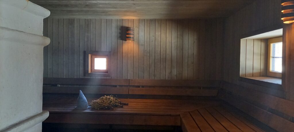 Pirties patalpoje (20 m²) telpa iki 10-12 žmonių. Puikiai tinka draugų susibūrimams ar šeimos šventėms.