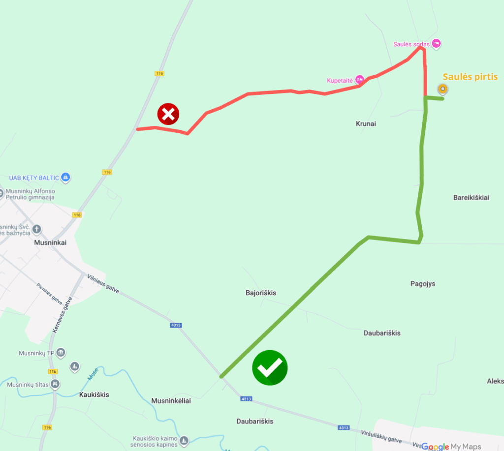 Į pirtį veda du keliai, tačiau pravažiuoti galima tik vienu iš jų. Žemiau esančiame žemėlapyje žalia spalva pažymėtas pravažiuojamas kelias, raudona – nepravažiuojamas.
